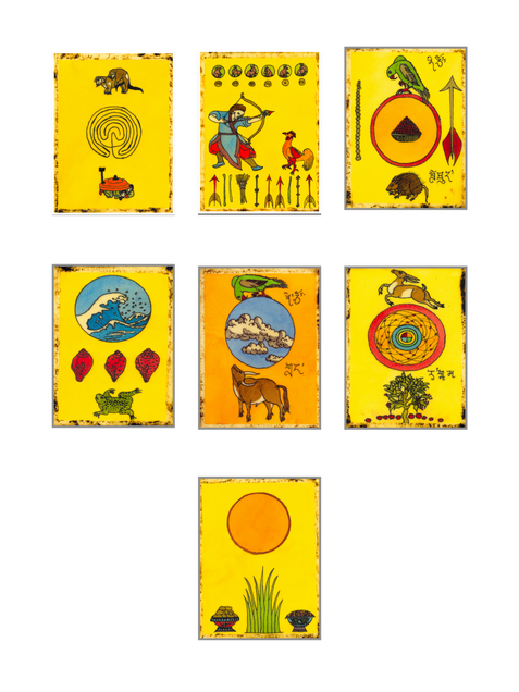 I received these 81 images that are now called Found in Transition in dreams and gave birth to them as paintings. Through my connection with Bon, the indigenous religion of Tibet, I discovered that this body of work evoked the ancient Bon tradition of scrying cards, used in prayer and for guidance. The images—in their format as cards—have been explored in a number of ways by myself and others. This includes creating a teaching wheel made up of nine groups, pictured below. An additional group called “The Hidden” includes two additional cards for each group, also described as “that which we cannot see”. We have learned that there are infinite ways to work with and be informed by these images.